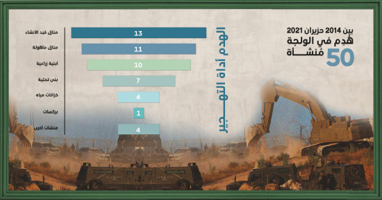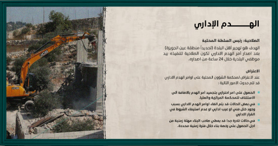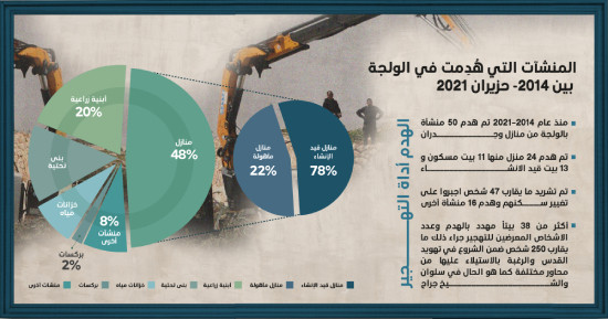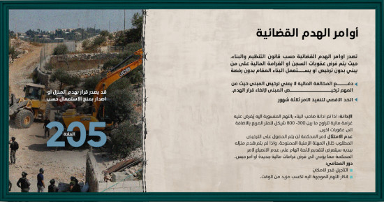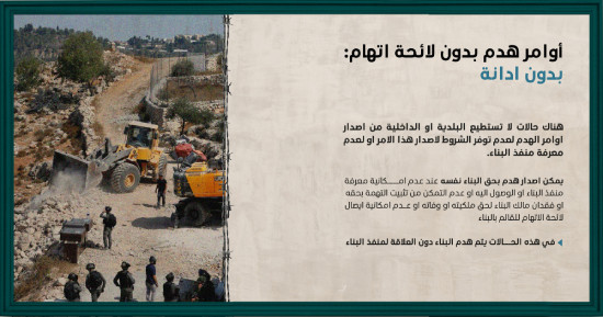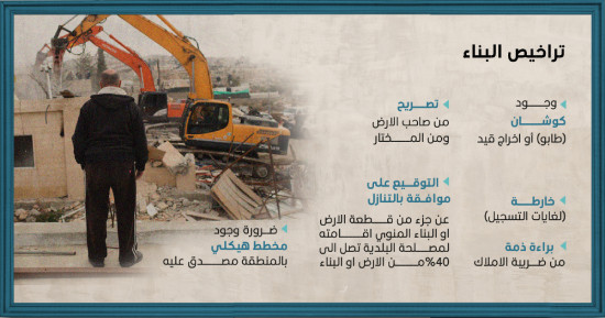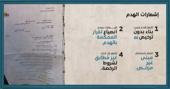 - يؤدي عدم اعطاء تصاريح للبناء، والقيام بهدم المنازل (بسبب عدم وجود تراخيص بناء) إلى انعدام الأمن والعيش في خوف وتهديد مستمرين.