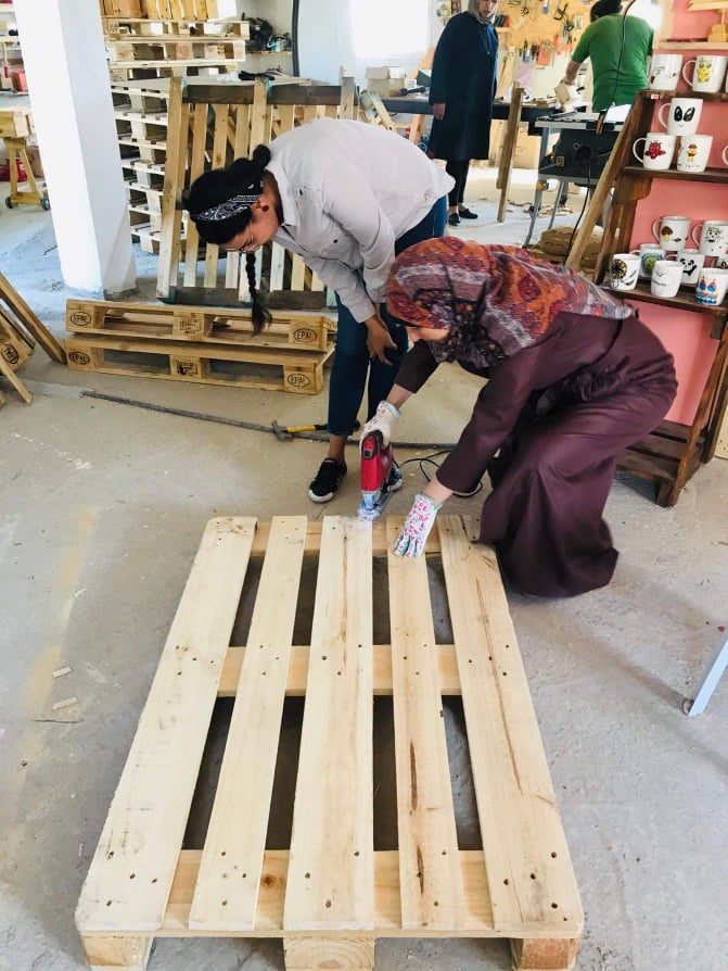 In 2020, we started offering upcycling trainings for beginners in our wood workshop in Al-Walajah. The trainings are open for adult participants of all ages on hand machines, such as the jigsaw, driller and sanding machine. The participants learn how to break down wooden pallets and clean them properly, before transforming them into a design through the correct and safe use of hand machines.
