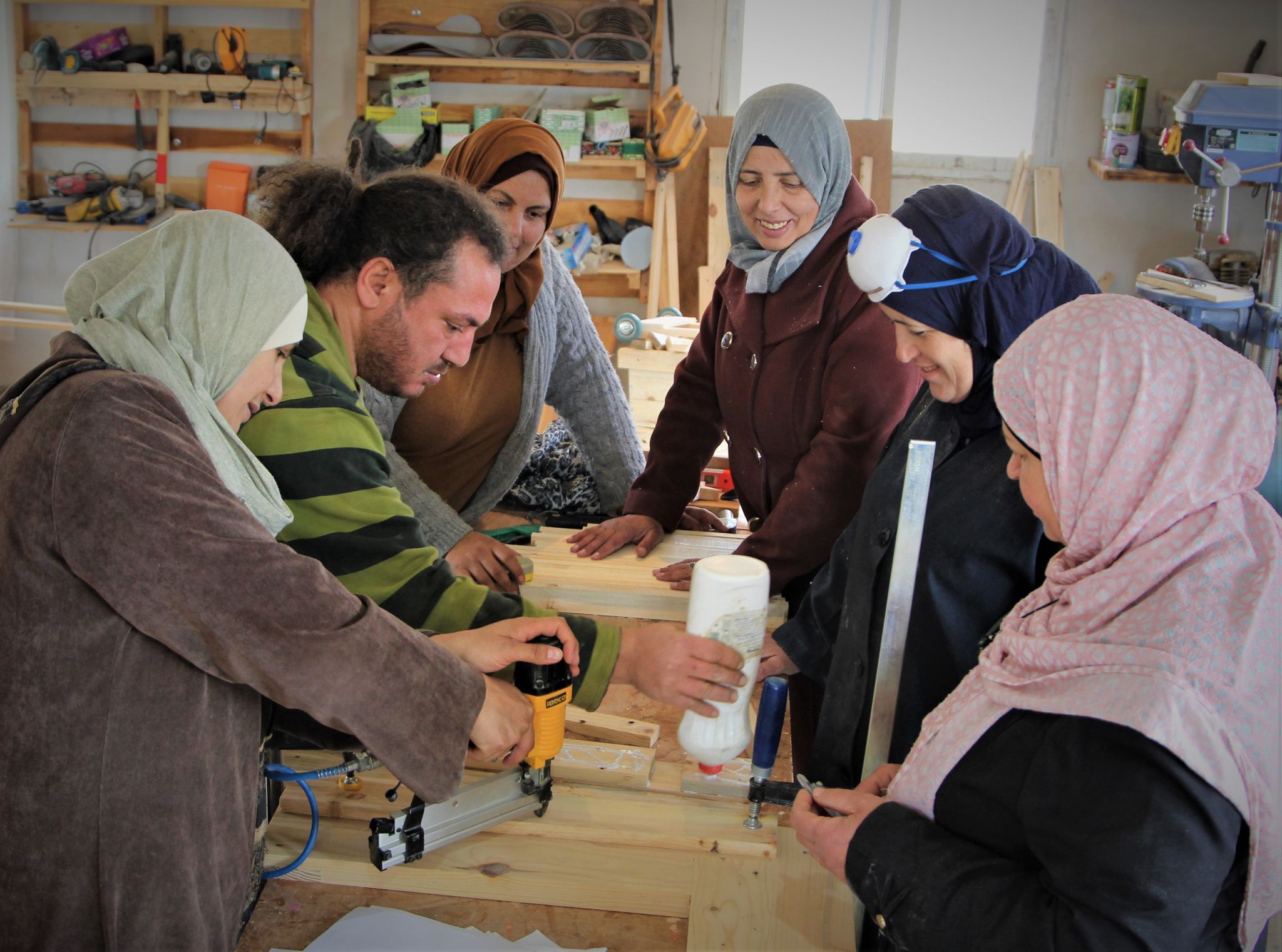 من عام 2017 وحتى عام 2019، تلقينا تدريبات على إعادة التدوير على الآلات الثقيلة من قبل المدرب علاء الحلو. تمكنا من الحصول على أساس متين في النجارة، والذي قمنا بتطويره وتحسينه باستمرار من خلال الاستخدام العملي للآلات في ورشتنا. بالإضافة إلى ذلك، شارك البعض منا في تدريبات النجارة في المراكز المهنية لتطوير مهاراتنا بشكل أكبر، مما سمح لنا بافتتاح ورشة الأخشاب الخاصة بنا وتقديم التدريب على الآلات الثقيلة.